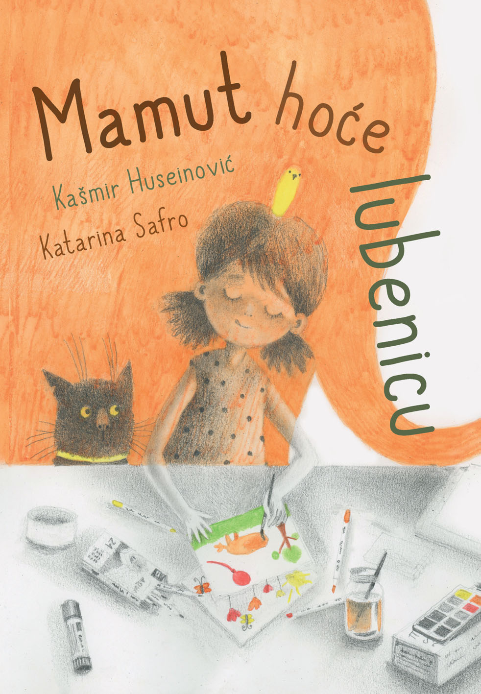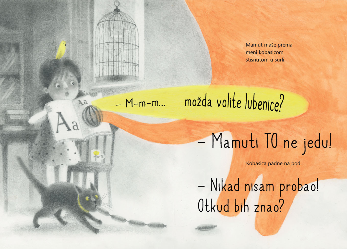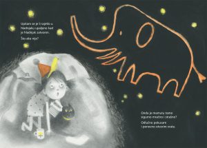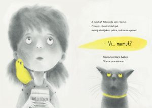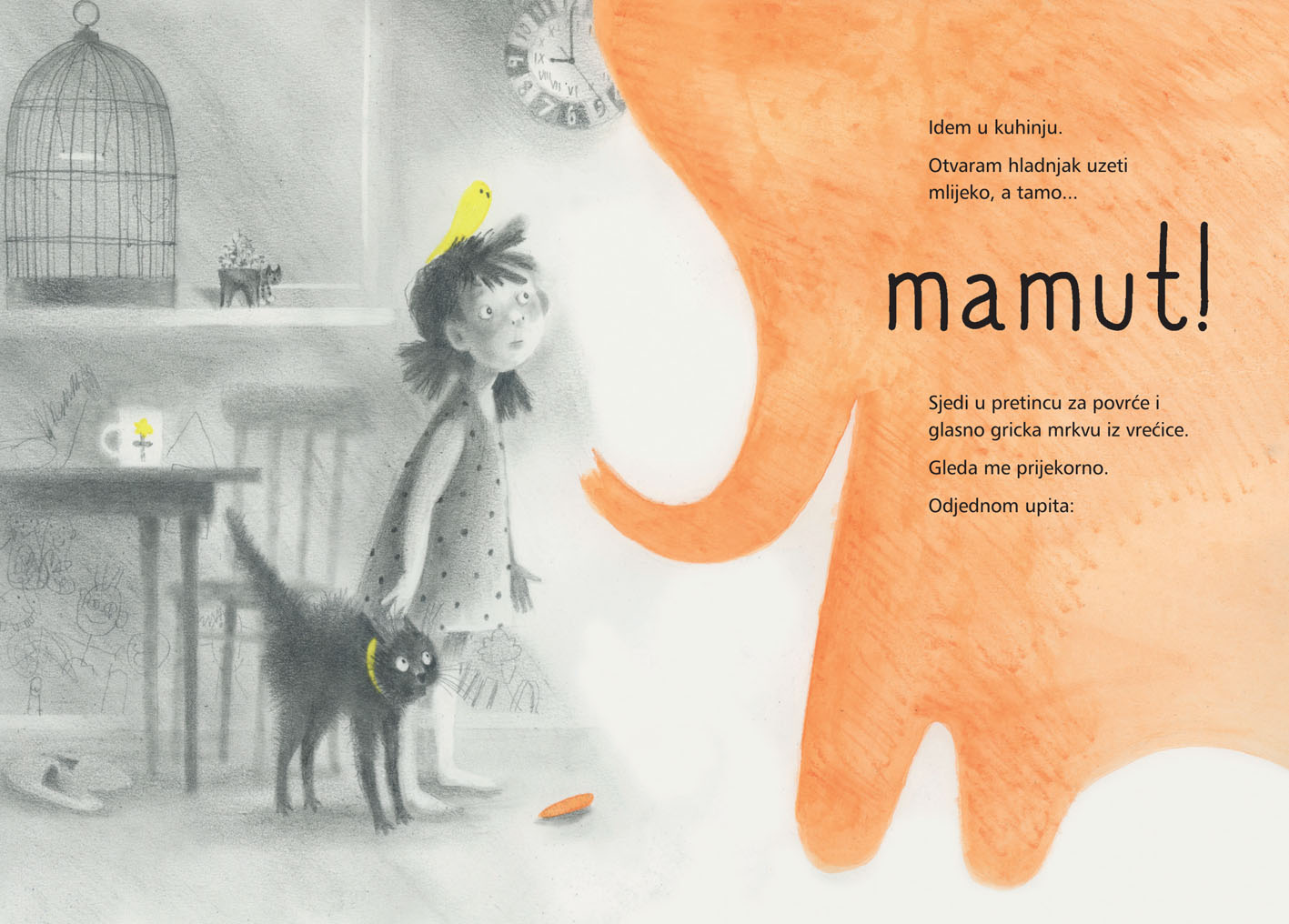 Predivno ilustrirana priča „Mamut želi lubenicu“ govori o djevojčici koja se jednog jutra probudi ranije kako bi uživala u vikendu. Vođena svojom beskrajnom dječjom maštom, dok odlazi po mlijeko u kuhinju, u hladnjaku „pronalazi“ mamuta — zapravo svoju igračku koja u njezinoj mašti oživljava i jede mrkve. Mamut joj prigovori što nije pokucala prije nego je otvorila vrata, pa djevojčica, iako iznenađena, započne razgovor s njim.