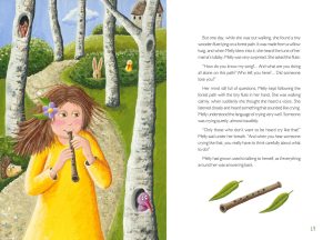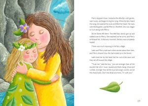 Like every quality picture book, this one has a single story but two narrators. The textual narrative, tells the story of a girl who, when she was born, was named Merry. However, she could not pronounce the letter R, so people began calling her Melly (“Melancholy”). And she truly was melancholic, even sad, as there was no peace in her home.